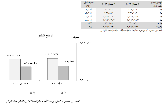 أنهت كلّ المؤشّرات النقديّة أسبوعها المنتهي في 9 نيسان 2026 على وقعٍ سلبيٍّ. في التفاصيل، إنخفضت الكتلة النقديّة بمفهومها الواسع، "م4"، ب371.76 مليار ل.ل. على صعيدٍ أسبوعيٍّ إلى 5،911.30 ترليون ل.ل. علماً أنّ محفظة سندات الخزينة المكتتَب بها من قِبَل القطاع غير المصرفي قد إنخفضت ب5.40 مليار ل.ل. في الأسبوع المذكور.
