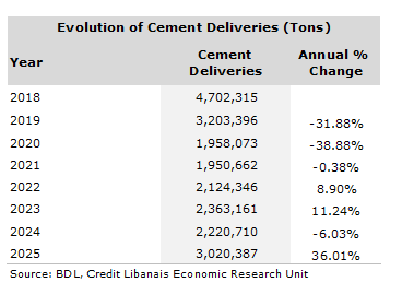 Cement deliveries, the coincident indicator of construction activity, fell by 2.61% during the month of December 2025 to 233,198 tons, down from 239,453 tons a month earlier. However, and on an annual basis, cement deliveries increased by 36.01% to 3.02 million tons in 2025, in comparison with 2.22 million tons in 2024, and just coming 5.7% short of the 3.2 million tons level registered in 2019 before the eruption of the local financial crisis. The rebound in cement deliveries in 2025 can be attributed to the improvement in the local political scene and security conditions.