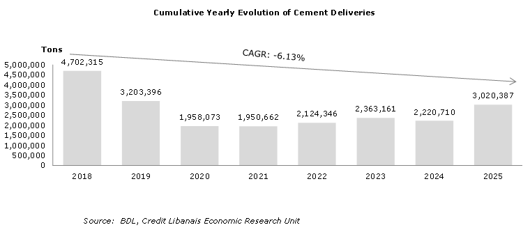 Cement deliveries registered a negative compounded annual growth rate (CAGR) of 6.13% over the 2018 –2025 period, mirroring the lackluster activity of Lebanon’s construction sector amidst the pale economic situation.