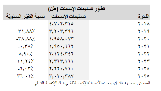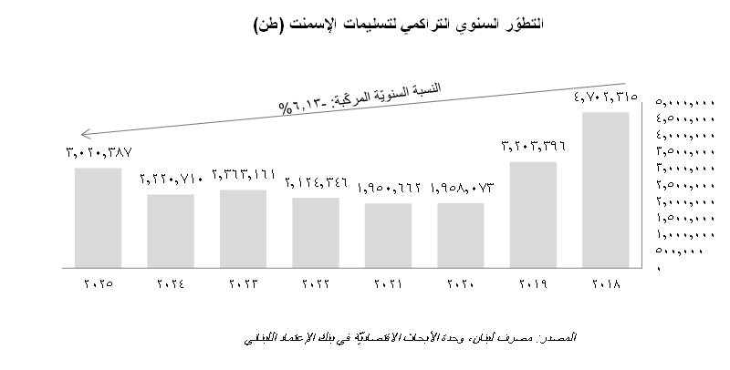 يُظهِر البيان التالي أنّ نسبة النموّ السنوي المركَّب (Compounded Annual Growth Rate) لتسليمات الإسمنت كانت سلبيّةً عند 6.13% خلال الفترة الممتدّة بين عاميّ 2018 وعاميّ 2025، ما يَعكس ضعفاً في ديناميكيّة قطاع البناء في ظلّ الركود الإقتصادي الذي تشهده البلاد.