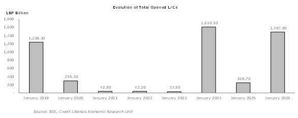 According to Banque Du Liban statistics, opened letters of credit (L/Cs), a measurement tool for trade activity, rose by 22.71% during the month of January 2026 to reach LBP 1,487.80 billion ($16.62 million), up from LBP 1,212.50 billion a month earlier. Similarly, on an annual basis, the face value of opened L/Cs came in nearly 6-times larger than the LBP 248.70 billion reading reported in January 2025.