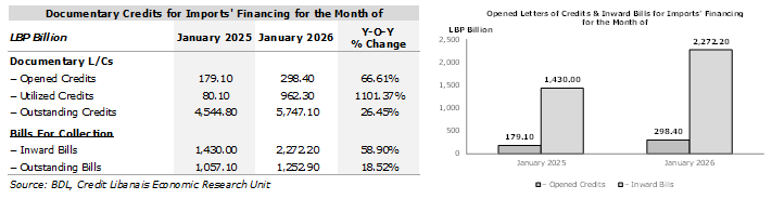Documentary L/Cs opened to finance imports activities reached LBP 298.40 billion ($3.33 million) in January 2026, compared to LBP 179.10 billion in the same month in 2025. Similarly, utilized credits for imports came in higher at LBP 962.30 billion ($10.75 million) with inward bills for collection, another documentary credit form of financing (backed by invoices), rising by 58.90% to LBP 2,272.20 billion ($25.39 million) in January of the current year, from LBP 1,430.00 billion in the same month of the previous year.