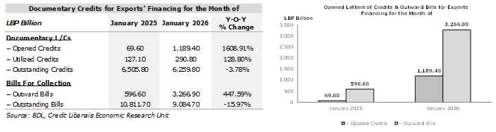 In a related note, documentary L/Cs opened to finance exports activities rose to LBP 1,189.40 billion ($13.29 million) in January 2026, up from LBP 69.60 billion in the same month in 2025. Concurrently, utilized credits to finance exports increased to LBP 290.80 billion ($3.25 million; 24.45% of opened L/Cs for exports). In parallel, the value of outward bills rose to LBP 3,266.90 billion ($36.50 million) in January, while outstanding bills for collection sank to LBP 9,084.70 billion ($101.51 million), from LBP 10,811.70 billion in the first month of 2025.