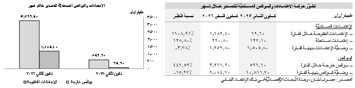 أمّا لجهة إعتمادات التصدير، فقد إرتفعت قيمة الإعتمادات المفتوحة للتصدير إلى 1،189.40 مليار ل.ل. (13.29 مليون د.أ.) في الشهر الأوّل من العام الحالي، مقابِل 69.60 مليار ل.ل. في الشهر نفسه من العام 2025. في المقلب الآخر، زادت قيمة الإعتمادات المستعمَلة للتصدير إلى 290.80 مليار ل.ل. (3.25 مليون د.أ.؛ أي ما يشكّل نسبة 24.45% من قيمة الإعتمادات المستنديّة المفتوحة للتصدير). من جهةٍ أخرى، إرتفعت قيمة البوالص الخارجة إلى 3،266.90 مليار ل.ل. (36.50 مليون د.أ.) في شهر كانون الثاني 2026، فيما تدنّى رصيد البوالص قيد التحصيل إلى 9،084.70 مليار ل.ل. (101.51 مليون د.أ.)، من 10،811.70 مليار ل.ل. في الشهر نفسه من العام السابق.