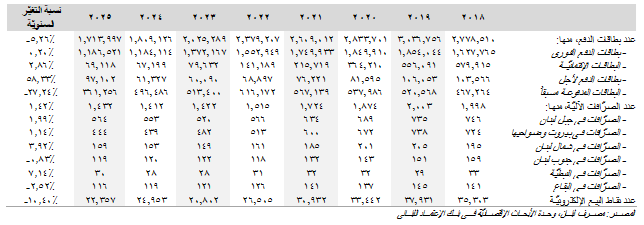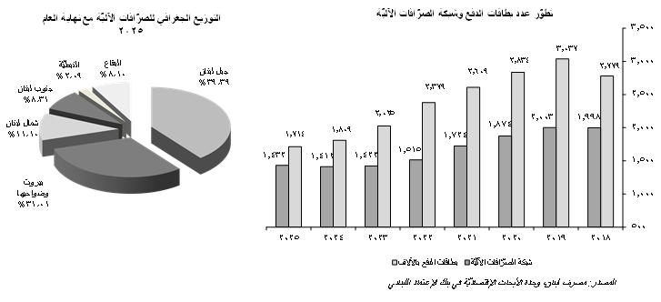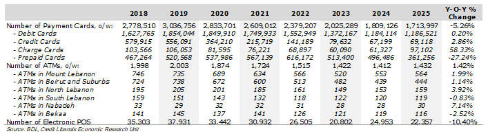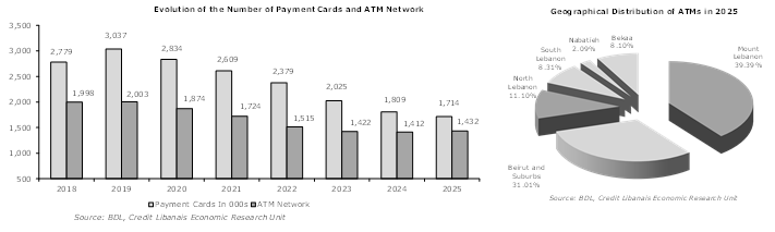 من منظارٍ آخر، توسّعت شبكة الصرّافات الآليّة للمرّة الأولى منذ بداية الأزمة في نهاية العام 2019 مسجّلةً زيادة سنويّة قدرها 1.42% )20 صرّاف آلي) في العام 2025 إلى 1،432 صرّاف آليّ، مقابل 1،412 صرّاف آليّ في نهاية العام 2024. وقد سيطرت منطقة جبل لبنان على أعلى نسبة تمركزٍ لشبكة الصرّافات الآليّة مع تواجد 564 صرّاف آليّ فيها، أي ما يشكّل 39.39% من مجموع شبكة الصرّافات الآليّة في لبنان، تلتها العاصمة بيروت وضواحيها 444 صرّاف آليّ <31.01%>)، ومنطقة الشمال (159 صرّاف آليّ <11.10%>)، والجنوب (119 صرّاف آليّ <8.31%>) والبقاع (116 صرّاف آليّ <8.10%>) والنبطية (30 صرّاف آليّ <2.09%>).